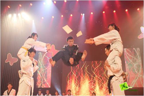 “取长矢,射天狼”,伴着《大唐》悲壮而震撼的古曲,子衿汉服社成员携原创舞台剧《香草美人》上演了一出千古传奇。灯光暗下,身着缀满彩灯服装的表演者上场,这便是由棍舞社所带来的原创棍舞。身着道服的跆拳道社成员一出场就令全场观众感受到了格斗术的奇异魅力,出拳、腾空、旋踢……每一个刚强有力的动作被他们展现得淋漓尽致。