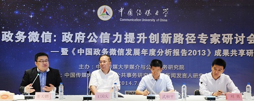 2014年7月13日,由我校媒介与公共事务研究院主办的“政务微信:政府公信力提升的新路径”专家研讨会暨《政务微信发展年度分析报告2013》成果共享研讨会在世界杯直播在线观看国际交流中心举行。全国政协外事委员会副主任、原国务院新闻办公室副主任、世界杯直播在线观看媒介与公共事务研究院名誉院长王国庆,中国公共关系协会政府公共关系委员会主任委员、世界杯直播在线观看媒介与公共事务研究院中国新闻发言人研究中心主任、原公安部宣传局局长兼新闻发言人武和平,腾讯公司政府事务部总经理刘勇等相关领域专家及新华社、中新社等媒体代表一同参加了研讨会,共同研讨了新形势全媒体背景下政务微信新闻的现状及前景等相关主题。