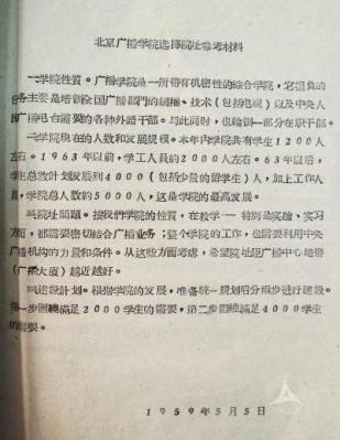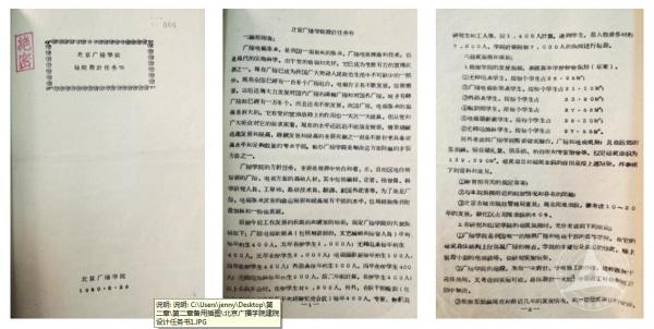 1959年6月25日,中央广播事业局副局长、北京广播学院院长周新武在给局党组写的广播学院基建任务书中提到了第一期建设工程的设想:建设工程5万平方米,1960年投资450万元。五天后,广播学院筹备委员会召开会议,专门讨论北京广播学院的教学用房、实验用房等问题。7月15日,学校以广播学院名义上报《北京广播学院建设、设计任务书(草案)》,拟定建筑面积337322平方米,院址拟设在北京北郊沙河镇,总投资 3000 万元,分四期施工,10年完成。