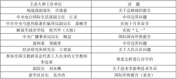 1959-1965年间,这三个系列讲座被作为固定的课程安排下来,每周一到两次。学院邀请政府有关部门领导和社会知名专家学者担任主讲,如北京市副市长吴晗、北大著名教授林焘和著名导演谢铁骊等。与此相配合的,青年教师们及时搜集相关主题的背景知识,编印成册,分发到学生手中作为参考资料,在每次讲座之后,针对学生提出的问题进行辅导和讲评。除此之外,学院还组织了大量的课外活动,如组织同学到煤矿、工厂参观,安排放映科教影片等。学院努力利用各种可以利用的资源和手段,以达到最好的教学效果。其中最为成功的是给1959级、1960级办的讲座。当时专家学者来校讲课,青年教师就在下面和学生一起做笔记,认真学习,不仅学习人家的知识和理念,还学习讲授技巧。这样坚持下来,原本没有什么教学经验的青年教师,也逐渐形成了自己比较成熟的教学方法和教学体系。