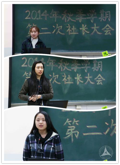 2014年11月27日中午12点半,世界杯直播在线观看2014年秋季学期第二次社长大会在48教A903教室展开。出席本次会议的有社团联合会主席邱皓若,执行主席张文强、李俊燃,社联各部门部长、干事以及各个社团的社长(或其负责人)。