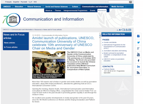 在学校的大力支持下,媒介与女性教席和联合国教科文组织建立了扎实良好的合作关系。此前教席的多项学术活动都得到教科文组织的支持,并被教科文组织总部的官网加以报道。通过联合国教科文组织的平台,我校的国际交流和发展得到了进一步拓展。