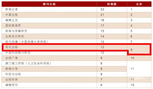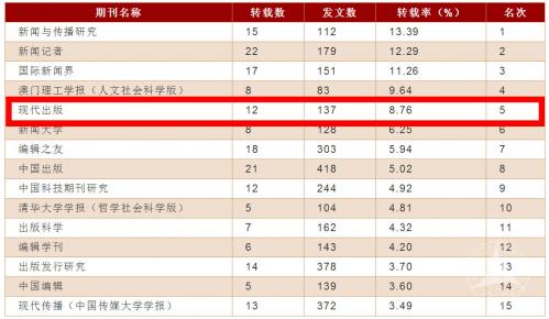 作为编辑出版类的专业期刊,《现代出版》每年出版6期,每期固定80个版面,在年发文量上难以与同类期刊比肩,但在新闻传播学学科期刊的转载量和综合指数两项排名中,《现代出版》依然取得了良好成绩:转载量为12,排名第8;综合指数为0.674160,排名第6。