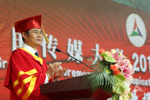相比陈文申书记的谆谆告诫,长江学者特聘教授胡智锋则用“赤子情怀、君子胸怀、学子心怀”勉励毕业生要走好事业之路、人生之路、生活之路,祝福与希望兼具,期待与启迪交融,流淌似溪水,温润如甘泉,滋润着每一位毕业生的心田。
