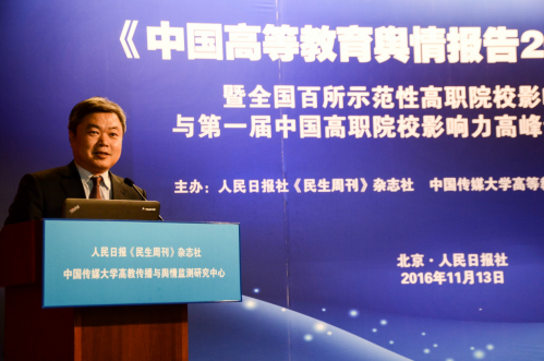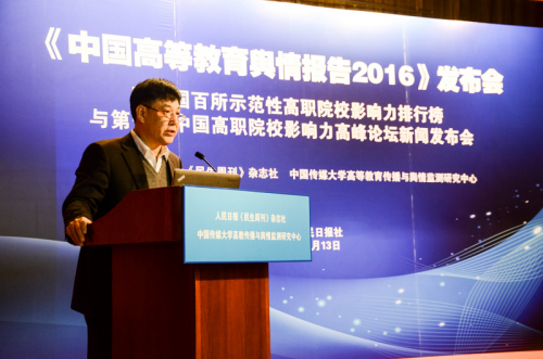 (通讯员 王保华)11月13日,由我校高教传播与舆情监测研究中心与人民日报《民生周刊》杂志社联合主办的“《中国高等教育舆情报告2016》暨全国百所示范性高职院校影响力排行榜与第一届中国高职院校影响力高峰论坛新闻发布会”在人民日报社举行。