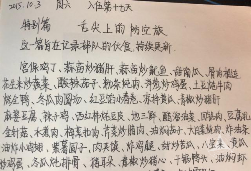 周天的上午基本就是整理内务和休息时间,突然想提一提部队的伙食情况,简直优于梆子井,谁说部队饭不好的,头伸过来,我给你加个BUFF。我们单位实行“612”伙食政策,简单地说就是6个主菜(包括2个荤菜,2个半荤半素,2个素菜)、1个汤、2个主食(米饭和馒头),总体来说是相当不错地,加上各种菜式和主食变换,周六日吃一次饺子和包子,简直不要太棒。