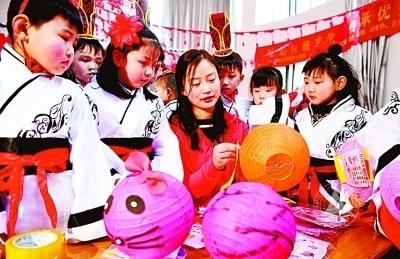 安徽省合肥市荷塘社区小朋友在志愿者指导下学习制作灯笼