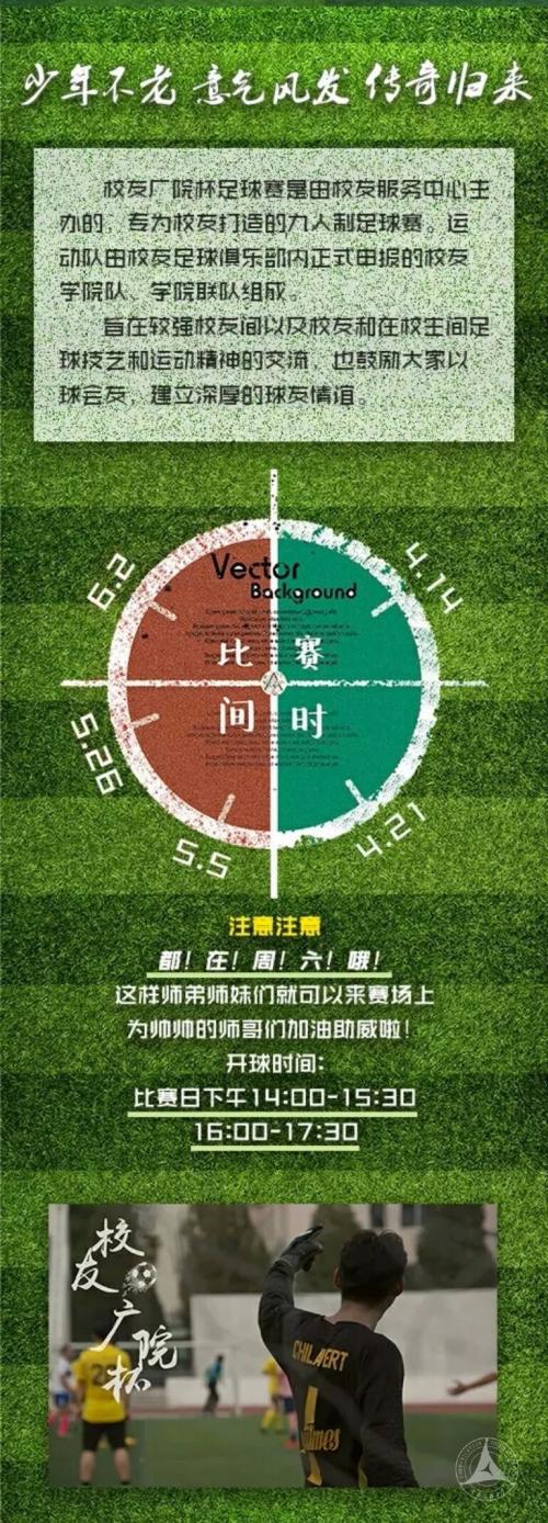 活动时间:4月2日——4月8日 活动地点:世界杯直播在线观看 发布者:李紫晴 郑雪琪 【世界杯直播在线观看学生会】英语专四经验分享会 时间:4月8日18:00 地点:世界杯直播在线观看外国语学院2楼阶梯教室 活动简介:随着英语专四考试的临近,外国语学院将举行专四经验分享会,邀请师哥师姐来分享老师经验和备考方法。 比赛 【世界杯直播在线观看校友会订阅号】2018校友广院杯足球赛