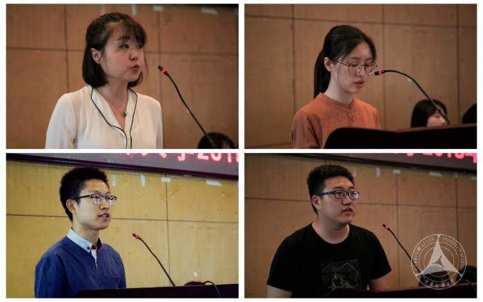 理工学部的王媛同学、文法学部的陈逍、理工学部研究生闫述涛同学分别作为勤工助学岗位标兵和先进个人代表发言,分享了自己的在勤工助学岗位上的工作感受和收获,畅谈了自己对于诚信、感恩、奋斗、青春的理解。