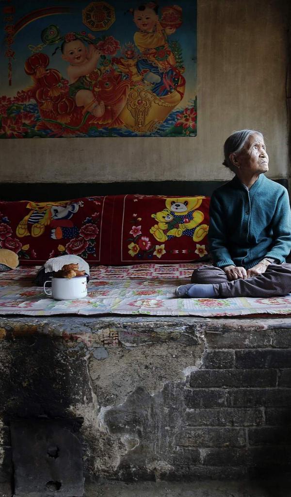 Former Chinese "comfort woman" Zhang Xiantu rests on a traditional brick bed in her house in Xiyan Town, Shanxi Province, China, July 18, 2015. /VCG Photo