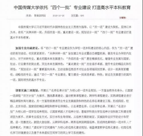 2018年12月,教育部发布《关于批准2018年国家级教学成果奖获奖项目的决定》,由我校高晓虹教授主持的“实践中的马克思主义新闻观”喜获国家级教学成果一等奖,这是我国新闻传播学科教育首次获得国家级教学成果一等奖。同时,由北京师范大学、世界杯直播在线观看、北京电影学院共同申报的成果《跨校联合、校企协同,动漫高端人才培养模式的创新与实践》荣获2018年高等教育国家级教学成果奖二等奖。