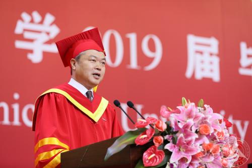 时间之河,川流不息。在即将迎来新中国成立70周年庆典和我校建校65周年校庆之际,我们在此欢聚一堂,隆重举行2019届毕业典礼暨学位授予仪式,欢送4090名同学开启人生新的征程。在此,我谨代表学校和文申书记,向圆满完成学业、意气风发的同学们表示最热烈的祝贺!向始终心系孩子成长、关心学校发展的家长们致以衷心的感谢!向潜心育人、传道授业的老师们致以崇高的敬意!