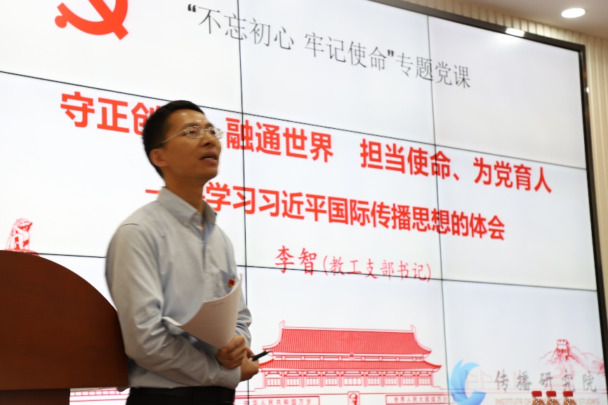 李智教授说,守正是基础,要恪守正道,不忘共产党人的初心、本心。创新是路径,要走出新路:一是渠道创新,构建融通中外的新概念、新范畴、新表述对外传播话语体系;二是内容创新,注重文化和国家形象的塑造;三是目标创新,争取国际话语权。融通是目标,“融”古今中外,“通”世界民心,要站在构建人类命运共同体高度上,打造各方合作的新疆域,构建互联网命运共同体。他结合自身的教学工作表示,要担当使命,为党育人,就把学术使命和政治使命相结合,把学术生命和政治生命相融合,增强作为传媒学术领域共产党人的忧患意识、使命意识和创新意识。他还汇报了传播研究院教工党支部在组织建设、制度建设、思想建设等方面取得的成绩,凝练了“以学习为主导、以实践为根本”的支部建设思路。