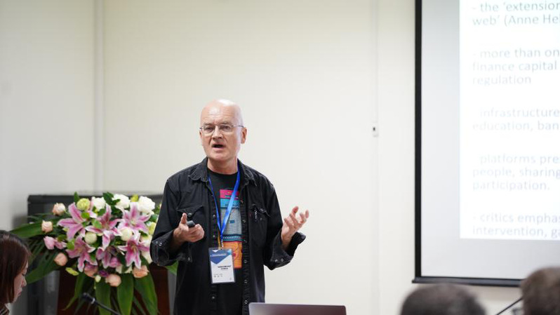 伦敦大学金匠学院Keith Negus教授以《后数字鸿沟与数据“反乌托邦”》为主题,从数据平台的资金链构建、数据贩卖、以及身份认同和数据关联等方面展开探讨。着重强调在后数字时代数据应该如何被利用以及有效地建构社会,并对智慧媒体和智慧受众等未来趋势进行相应预判。上午的主旨演讲结束后,参会师生还就快手与阶层分化问题进行了互动交流。