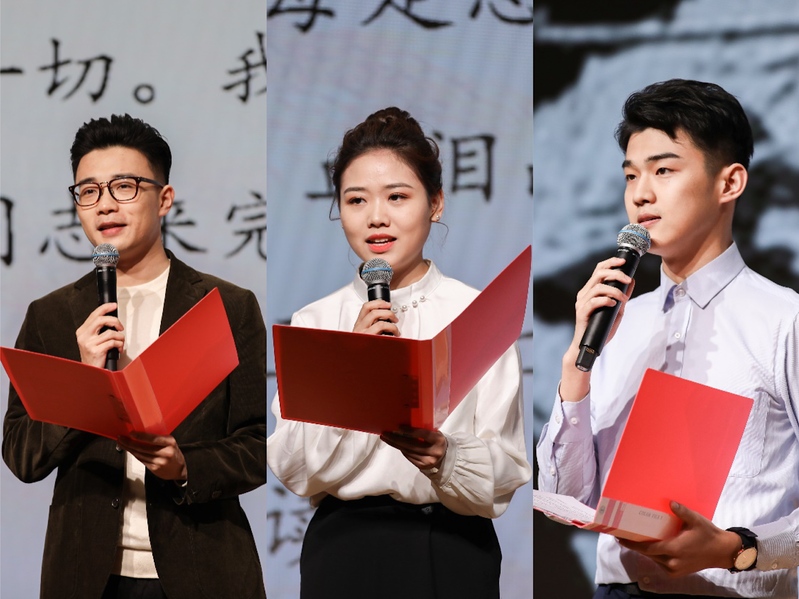播音主持艺术学院田尹男、张琪琦、孙庆坤三位同学登台朗诵了烈士夫妻陈觉、赵云霄的绝笔信笺以及抗日英烈赵渭滨的书信,深情的朗诵,将师生带回了那个战火纷飞的年代,先烈们为了人民解放、民族独立不惜抛头颅、洒热血的英雄壮举,极大地激发了师生党员的爱国热情、责任担当和奋斗精神。