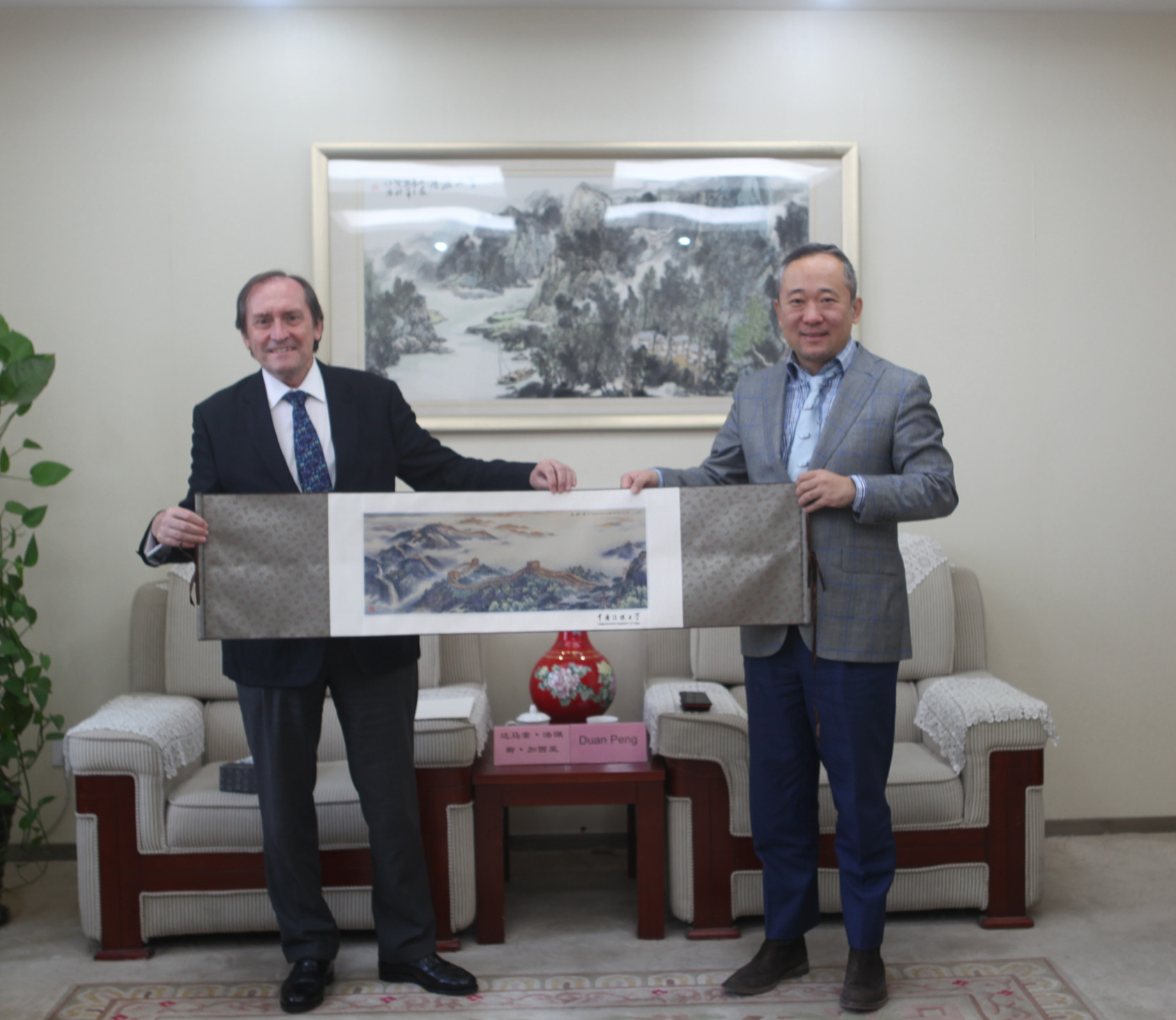 段鹏副校长向加西亚副校长介绍了我校的发展历史、办学特色、“双一流”学科和优势学科的总体建设情况以及国际交流合作的新态势,并表示,基于两校现有的西班牙语人才培养合作,在我校共建“康普顿斯研究中心”不仅能深化两校之间的合作,还将促进中西文化的传播与交融。西班牙有着灿烂的历史文化和艺术传统,两校可以在相关领域开展学生短期交流等合作。