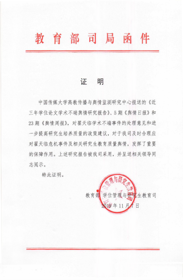 研究生司在采用证明中指出,上述报告中提出的进一步规范学位论文管理制度、提高研究生培养质量的政策建议,对于合理地应对学位论文买卖、代写,翟天临危机事件以及相关研究生教育质量舆情,发挥了重要的保障作用。