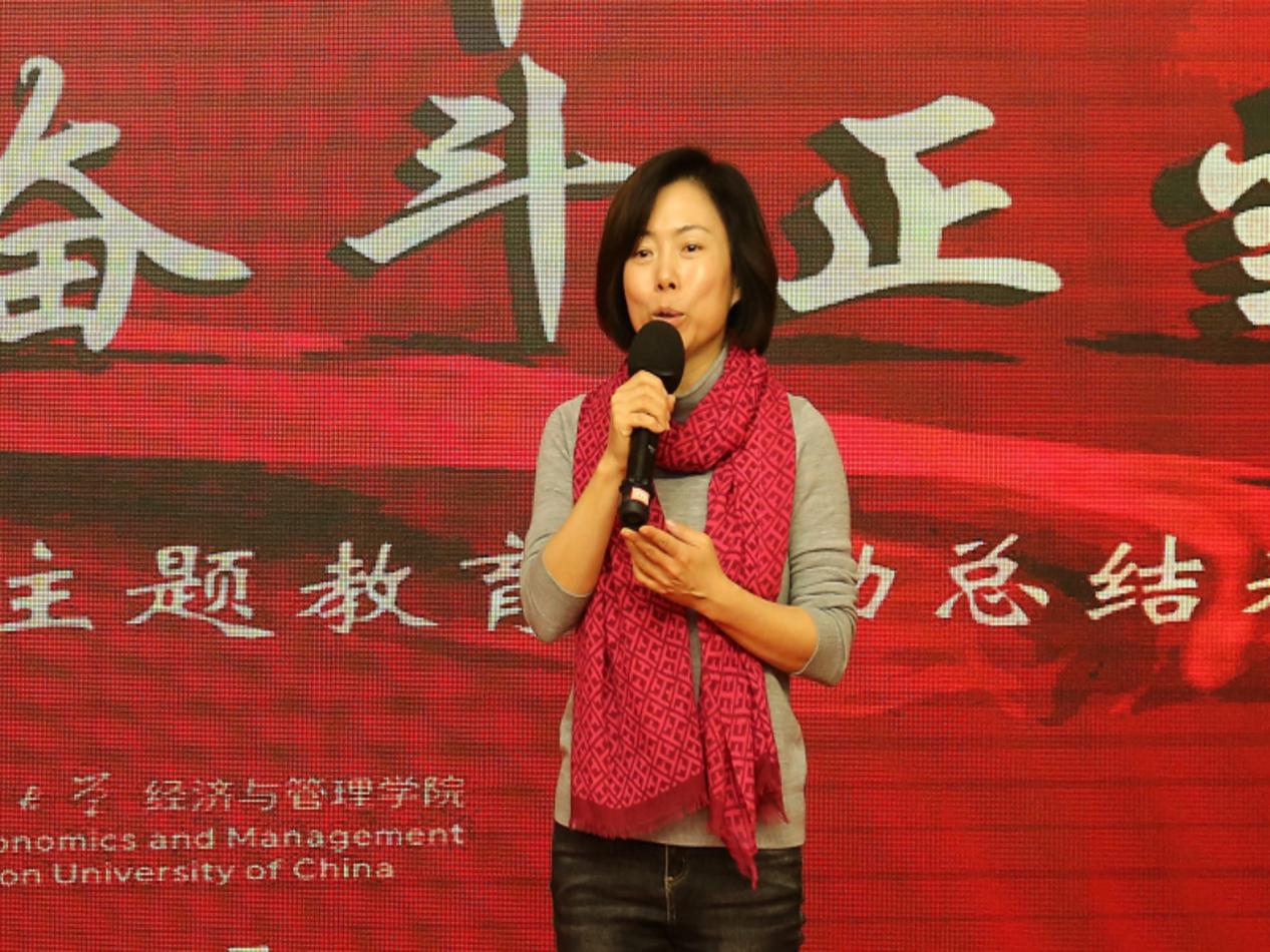 经管学院党委书记金雪涛作总结发言。她首先向学校领导、各职能部门表示由衷的感谢,并对学院师生在国庆活动中出彩表现以及2019级新生们的军训成绩给予了高度肯定。金雪涛书记表示,此次表彰大会既是学院爱国主题教育系列活动的成果展示与经验总结,又是一堂极为生动的思想政治课程。学院将按照“不忘初心、牢记使命”主题教育与新生引航工程的要求,以培养热爱祖国、奉献人民、开拓创新、奋发有为的青年学子为己任,不断加大爱国主义教育的力度,让爱国主义精神代代相传、发扬光大。