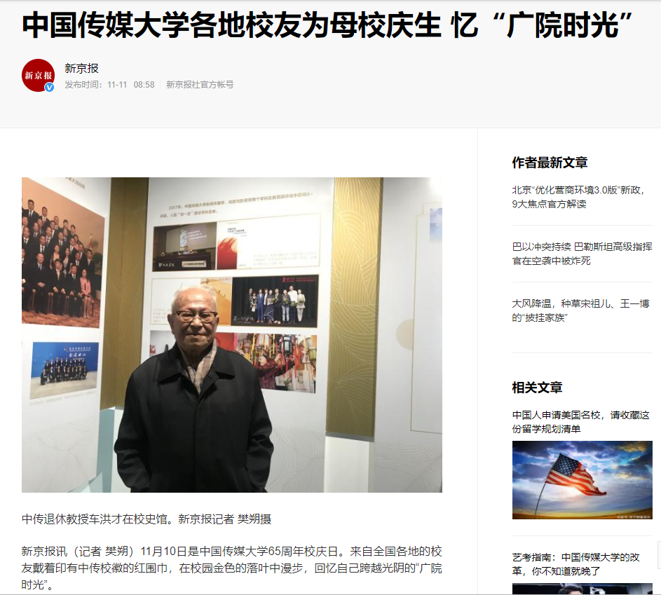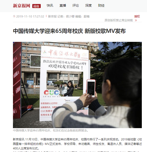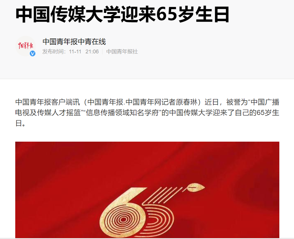11月9日,《中国教育报》在头版头条刊发文章《答好教育的根本问题——世界杯直播在线观看落实立德树人根本任务纪实》,系统介绍了世界杯直播在线观看对于“培养什么样的人,怎样培养人,为谁培养人”这一根本性、时代性命题的回答。廖祥忠校长在校友座谈会上就人才培养、学科建设、体制机制改革、通识教育等方面擘画的系统办学理念,也被各大媒体纷纷报道,产生了很大的社会影响力。时至今日,社会媒体对中传65周年校庆的报道仍在持续。11月18日,中央电视台音乐频道在《音乐周刊》节目中进行了专门报道。