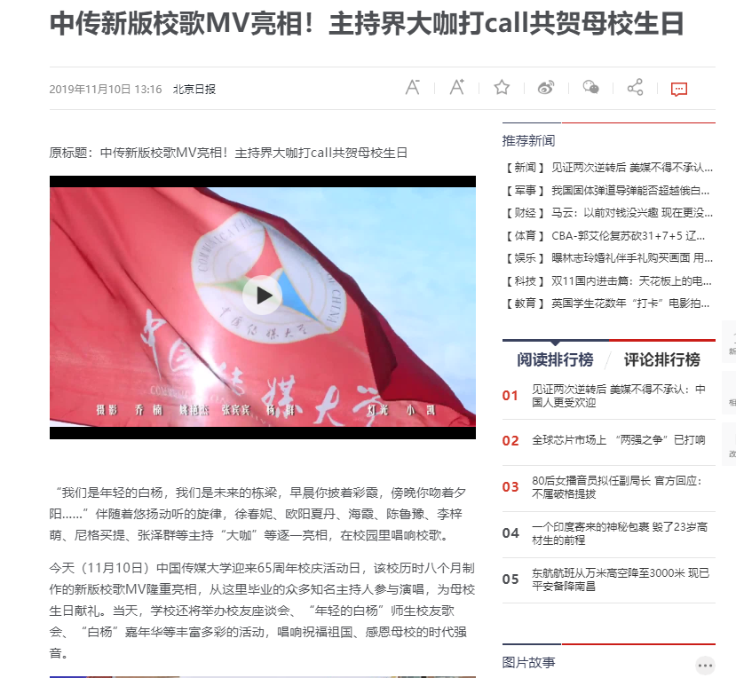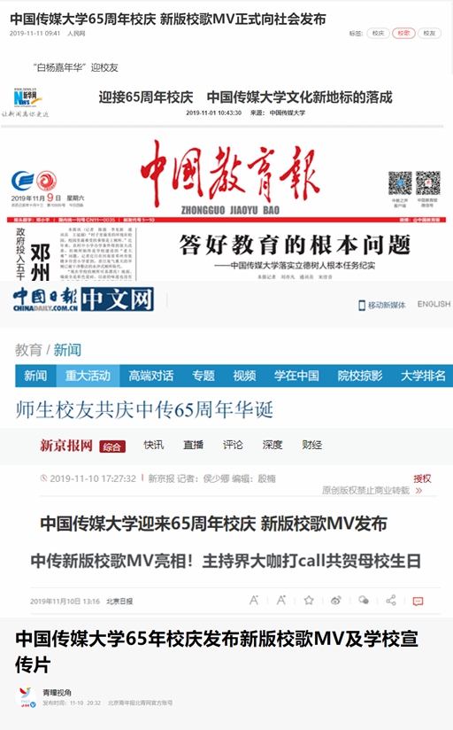 新版校歌MV的发布成为社会媒体关注的焦点,中国教育电视台、新华网、中国青年报等媒体对校歌MV的发布会进行了重点报道。校歌MV故事版在爱奇艺PC端首页今日焦点图、移动端首页资讯头条推荐24小时,娱乐频道PC端、移动端首页首屏推荐24小时;资讯频道PC端、移动端首页首屏推荐48小时;校歌MV音乐版在音乐频道PC端、移动端首页首屏推荐24小时。各大媒体一致肯定,“(校歌MV)形成了‘青春、活泼、情怀、前瞻’的总基调,承载了‘立德、敬业、博学、竞先’的校训精神和‘忠诚、自信、包容、竞先’的中传文化基因,是一部浓缩了中传文化精神内核和凝聚师生校友爱校、荣校、兴校情怀的优秀作品。”我校宣传片《传媒之光照亮与祖国同行之路》发布后,媒体也纷纷转载报道,其“双线”叙事结构和创新性的“讲述”方式也广受媒体的关注与肯定。