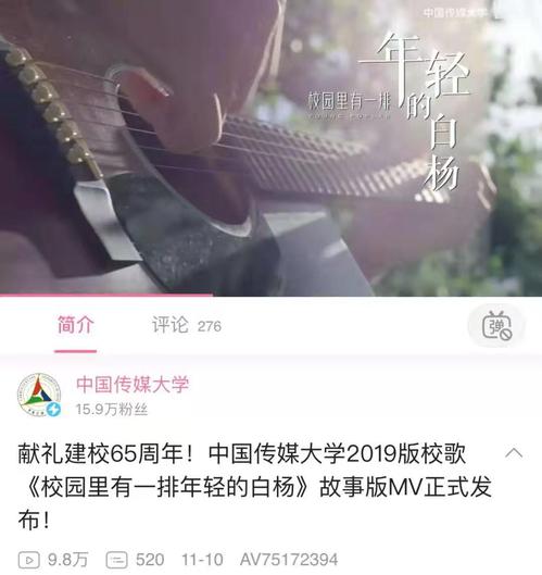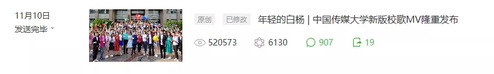 从10月24日起,校庆宣传进入密集期,官微先后推出校庆相关推文17篇,包括校庆公告、校庆标识、校庆头像框、新版校歌MV、学校宣传片,中传文化广场揭幕仪式,留学生表白母校,对校庆活动日主要活动的多角度展示,校友对母校的祝福等信息。每一篇推文都得到了师生、校友、媒体的广泛关注,大家纷纷留言、点赞、转发。据统计,17篇校庆推文总阅读量超过88万,点赞数超过1万,留言接近2000条。其中,《年轻的白杨|世界杯直播在线观看新版校歌MV隆重发布》推出后,立即引发刷屏狂潮,2小时内阅读量突破10万,5小时内阅读量突破20万,此后连创新高,总阅读量已超过50万。