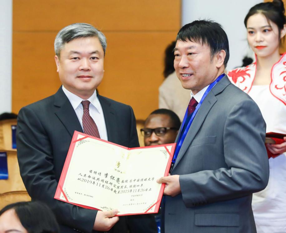 廖祥忠校长为人类命运共同体研究院院长李怀亮教授颁发聘书