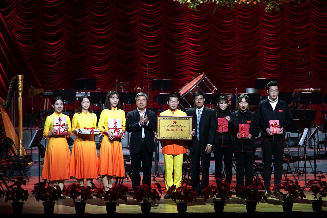 在音乐会正式开始之前,陈文申书记首先作新年致辞。他带领大家回顾了我校2019年取得的丰硕成果,并对全校师生致以诚挚的新年问候与祝福。致辞后,陈文申书记、廖祥忠校长共同为在新中国成立70周年庆祝活动中,参与广场合唱、音频保障服务的师生代表颁发了先进集体奖和个人奖。音频保障团队获得北京市庆祝活动领导小组音响保障指挥部荣誉表彰,广场合唱队伍获得“北京市筹备和服务保障中华人民共和国成立70周年庆祝活动先进集体”嘉奖。