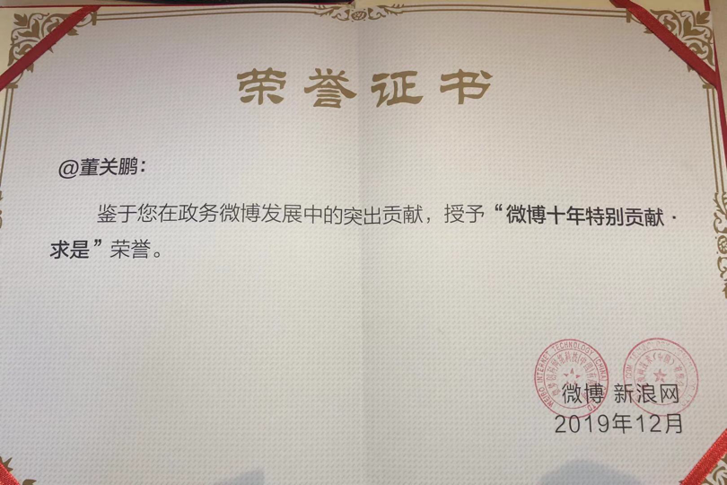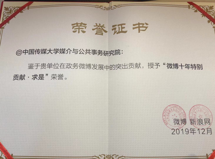 我校媒介与公共事务研究院获得“微博十年特别贡献·求是”集体荣誉,是唯一获此殊荣的学术机构。同时,我校政府与公共事务学院院长董关鹏教授和研究院政务新媒体实验室主任侯锷,获得“微博十年特别贡献·求是”荣誉;研究院健康与环境传播研究所所长,北京市原环境保护局党组副书记、副局长、新闻发言人、政务微博大V“巴松狼王”杜少中获得“微博十年特别贡献·创新”荣誉。这些荣誉的取得,是对政务微博十年发展历程中,研究院以及相关专家坚持深入全国各地政务微博第一线做实地调研,针对大量政务微博账号作样本研究,为政务微博发展提供长期智库支持,对中国政务新媒体发展起到的积极推动作用的高度肯定和表彰。