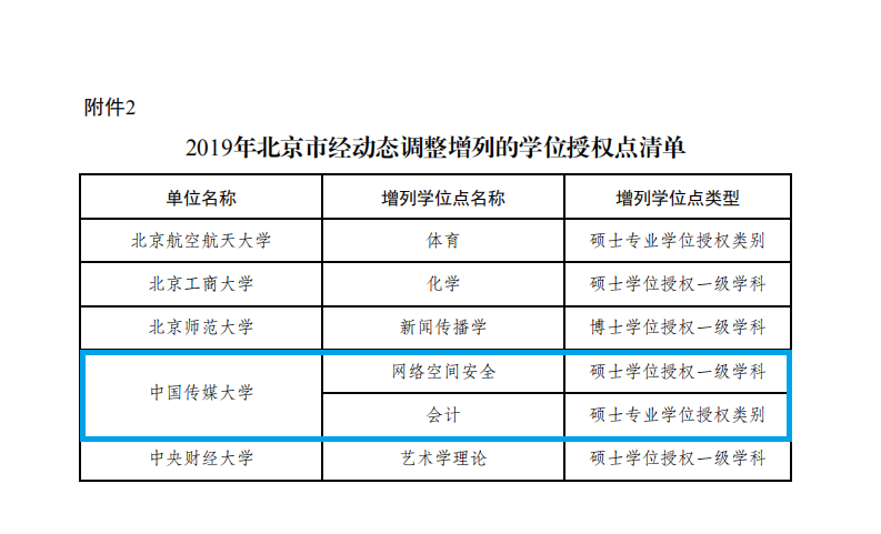 (通讯员 王若楠)近日,国务院学位委员会发布了《关于下达2019年动态调整撤销和增列的学位授权点名单的通知》(学位〔2020〕3号),审议批准了2019年动态调整撤销和增列的学位授权点名单,我校增列网络空间安全硕士学位授权一级学科点(代码:0839)和会计硕士专业学位授权类别(代码:1253),撤销软件工程硕士学位授权一级学科点和企业管理硕士学位授权二级学科点。