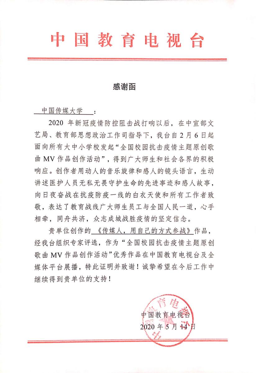 (通讯员 吉也)由世界杯直播在线观看出品,音乐与录音艺术学院博士生、本科生以及毕业生共同创作的原创歌曲《传媒人,用自己的方式参战》,在疫情期间推出后广受社会各界好评。日前,中国教育电视台特此向学校发来感谢函,向传媒学子在疫情期间所做出的工作表达了肯定与感谢,并希望今后继续得到世界杯直播在线观看的支持。