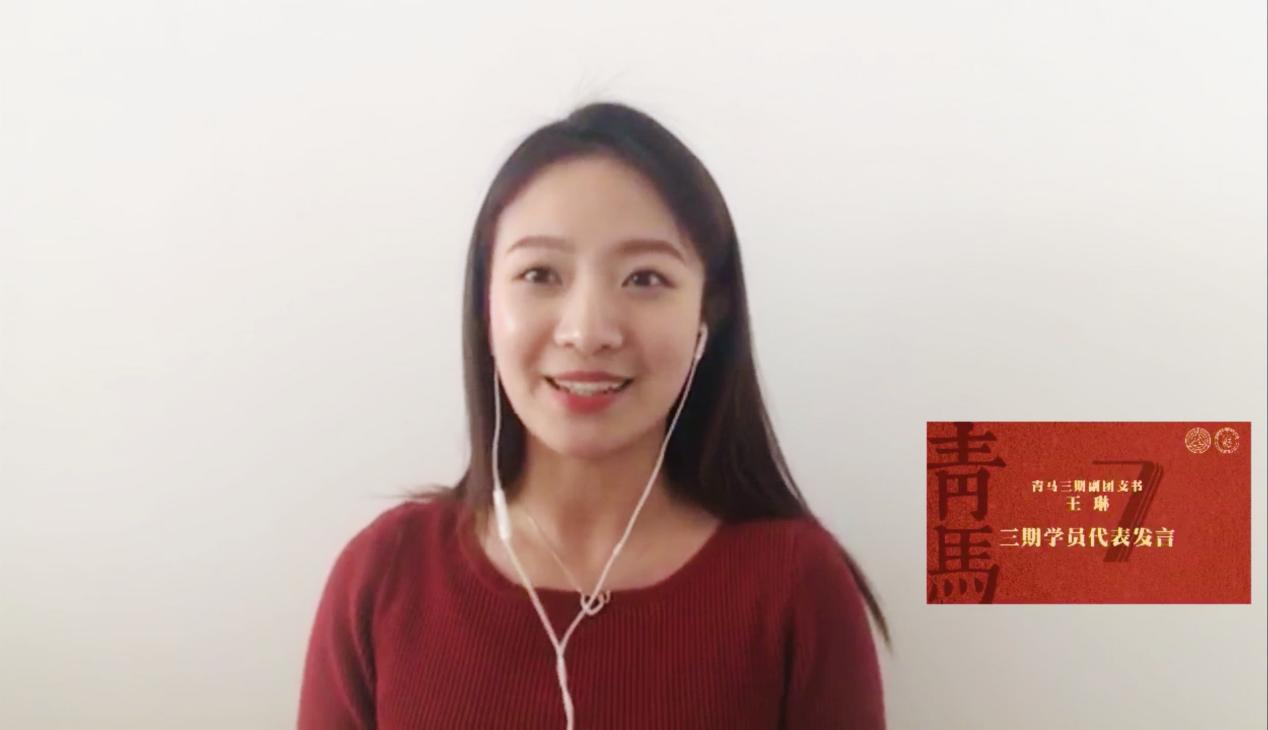 王琳代表三期学员发言。她回顾了在青马学院的学习经历与成果收获,并表示:青马学院为我们开拓了理想信念的广阔天地,成为我们审视自我价值与社会责任的重要指引,让我们深谙青春的宝贵价值,相信自我,相信青年的力量。