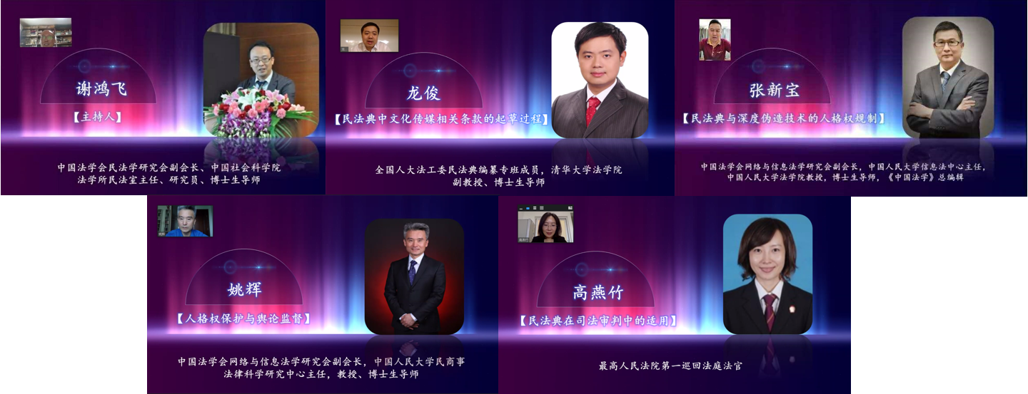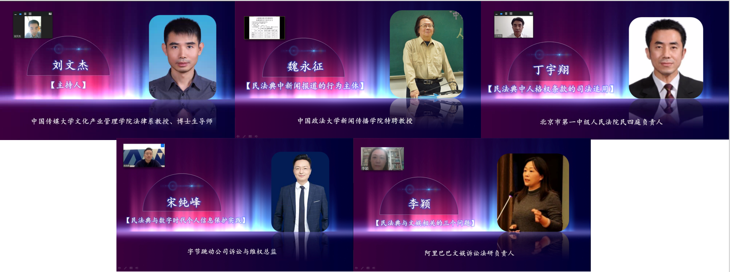 中国政法大学新闻传播学院特聘教授魏永征教授、北京市第一中级人民法院民四庭负责人丁宇翔法官、字节跳动公司诉讼与维权总监宋纯峰先生、阿里巴巴文娱诉讼法研负责人李颖女士围绕 “民法典中新闻报道的行为主体” “民法典中人格权条款的司法适用” “民法典与数字经济时代个人信息保护” “民法典与文娱相关的三个问题”,对民法典的相关条款的具体适用提出了对策建议。