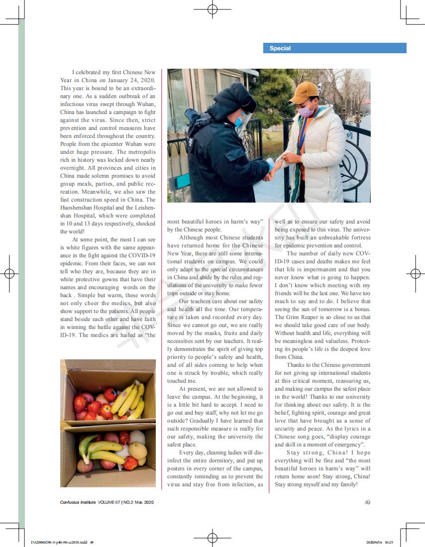 文章从一个留学生的视角,讲述了疫情期间在我校生活学习的种种经历,以及自己在疫情期间获得的关怀与帮助,感受到的各种温暖与感动,并由衷地为中国人民加油,盼望这场疫情早日结束。