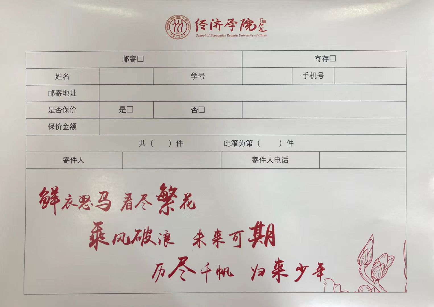 为了保护毕业生隐私,中国人民大学经济学院的老师用一些特殊词语替代衣物、书本等。如,“鲜衣怒马”对应衣服、“看尽繁花”对应零碎物品。受访者供图