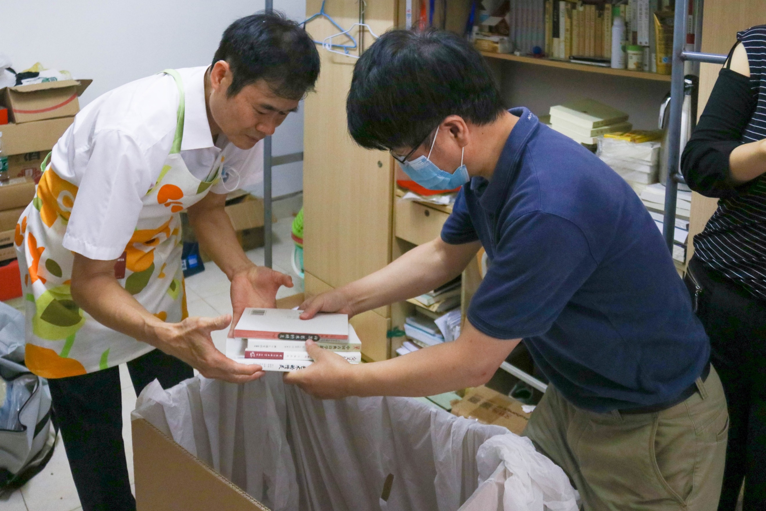 陈文申书记在梆子井宿舍与人文学院文艺学专业硕士生导师李有兵一起为学生收拾书籍