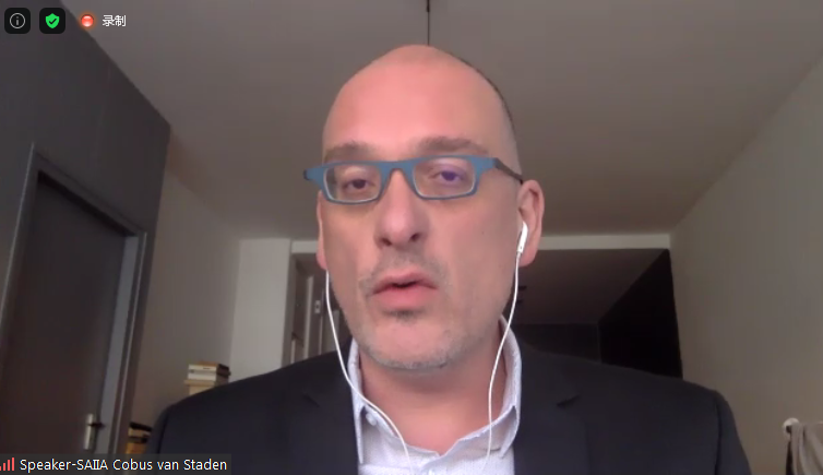 中非研究计划高级研究员Cobus van Staden从非洲国家面临的困境谈起,认为美国、欧洲和中国都是非洲的重要伙伴,非洲也正在努力维持这些合作关系。他重点提出,中国呼吁的全球金融体系改革对非洲至关重要,每个人都应以更具建设性的方式共同努力,不仅要克服新冠肺炎本身,而且还要朝着解决气候变化等更大挑战的多边问题的方向迈进。
