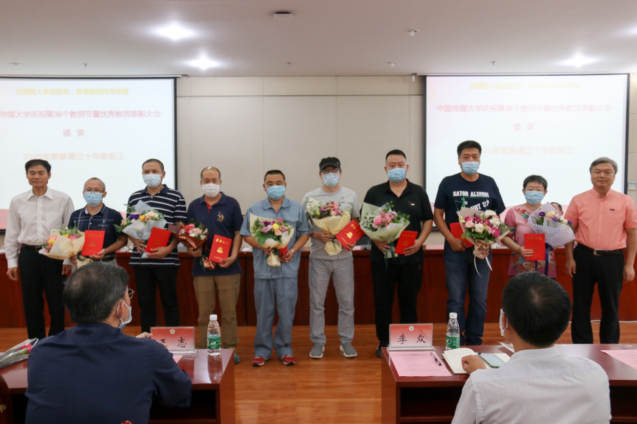 陈文申书记指出,今年,国家将第36个教师节的主题定为:立德树人奋进担当,教育脱贫托举希望。这个主题有着特殊的含义和背景。这一年我们面对突如其来的疫情影响,在党中央国务院的坚强领导下,全国1700余万大中小学教师经受了严峻的考验,开展了一场史无前例面向2.8亿学生的大规模在线教育实践,有效实现了不停课、不停学,为中国特色的复学复课、为打赢疫情防控总体战、阻击战谱写了一曲特殊的交响乐。在这次战役中,我们的广大老师以高度负责的精神,转战线上教学,特别是通过在线答辩等方式让毕业班的同学们顺利完成学业,精心组织了独具中传特色的云上毕业典礼,广大教师在近40度高温下深入宿舍一线开展“毕业寄”工作,体现了教师教书育人的大爱,更体现了“立德树人”的根本。同时,作为今年教育部新增的定点扶贫高校,学校党委举全校之力,认真落实党中央和教育部党组的扶贫攻坚任务,充分发挥学校学科的优势,助力科右前旗脱贫攻坚。各相关部门和学院的同志们多次赴科右前旗对接、推动帮扶工作,取得了非常可喜的成果,得到了当地政府和人民的高度认可。扶贫干部刘京晶、安明泰两位同志,深入基层、排除万难,运用自己的专业所长到艰苦的地方创造性地开展工作。这样的精神,便是这次教师节的主题所弘扬和提倡的。