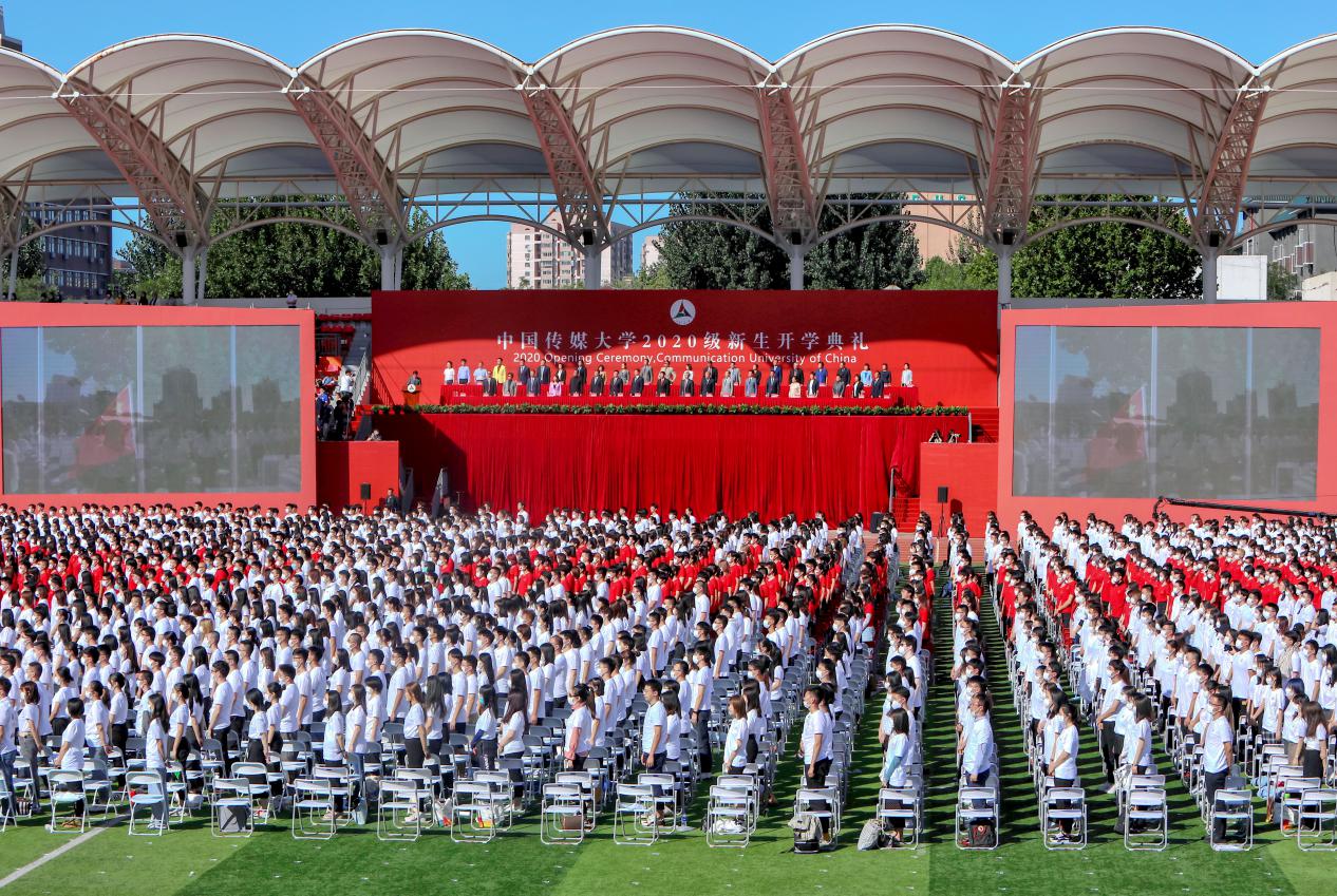 (记者 王维家 宋佳音 阎玺 梁楠 摄影 宋泽毅 缑宇 申皓文 巫林泓 张筠棣 师纪元 谷依凝 马欣然 朱皓月 周柯利 刘畅 王子杭 刘洋 王锦添 卢肖依 方嘉仪 余蓉茜 李佳雨 刘与白 贾桐林 司书堃 陈一鸣 赵溢清)初秋的校园天朗气清,景色宜人,伴随着《校园里有一排年轻的白杨》校歌优美的旋律,5300余名2020级新生汇聚到体育场,怀着兴奋而激动的心情迎接他们成为中传人的第一个重要时刻——开学典礼。