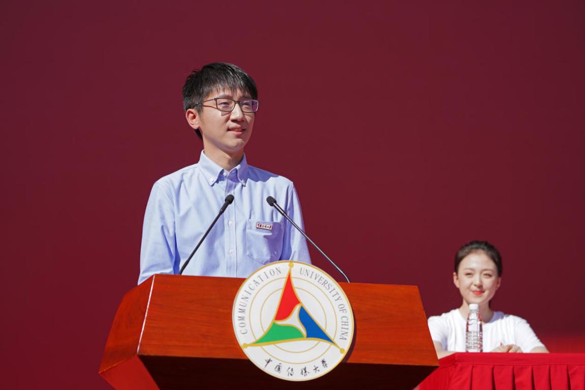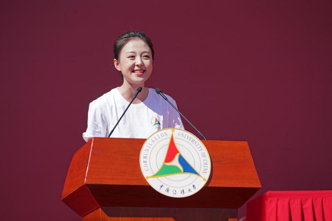 播音主持艺术学院2020级蔡紫涵同学代表全体新生宣誓,在未来四年认真读书,刻苦学习,提升专业能力;放眼世界,培养超大格局和胸怀;心怀大爱,奉献祖国和人民,努力成为“弘道崇德,经世致用”的新时代优秀传媒人才,用坚实的脚步为青春标下生动的注脚。