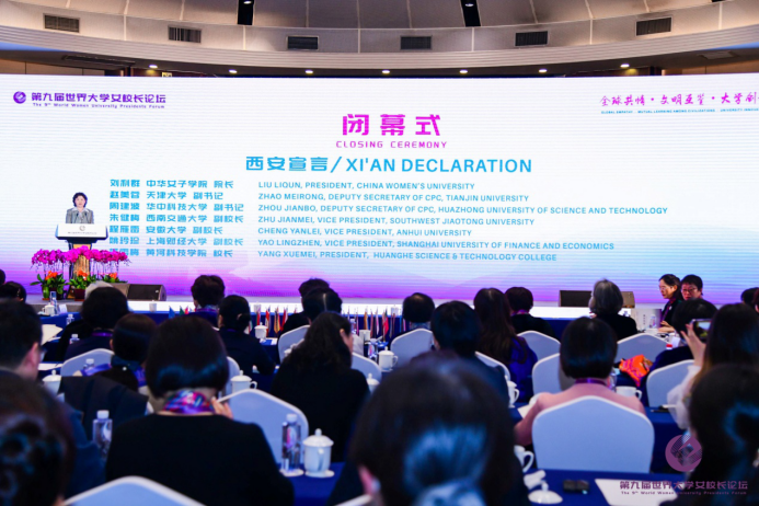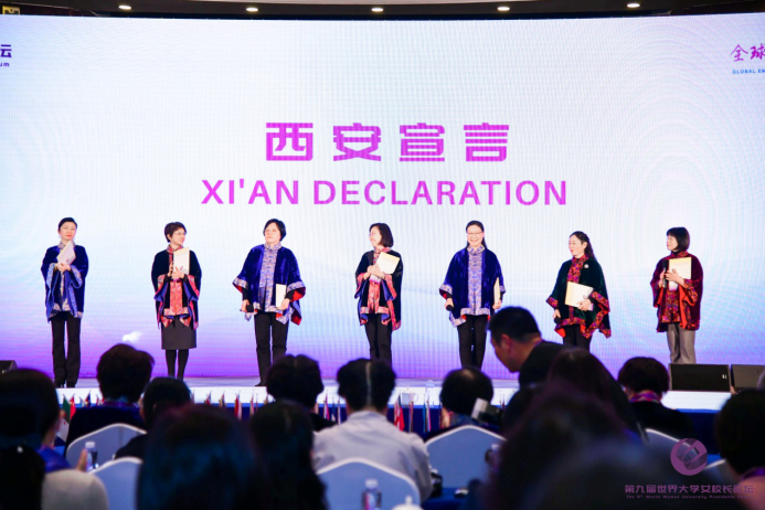 中华女子学院院长刘利群、天津大学党委副书记赵美蓉、华中科技大学党委副书记周建波、西南交通大学副校长朱健梅、安徽大学副校长程雁雷、上海财经大学副校长姚玲珍、黄河科技学院校长杨雪梅等七位校长共同宣读《西安宣言》,与会嘉宾一致通过《西安宣言》。《宣言》确定,第十届世界大学女校长论坛将于2022年在吉林外国语大学举办。