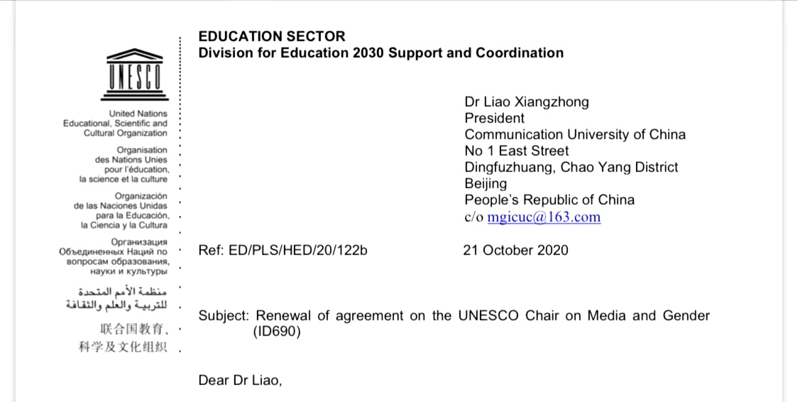 此次“媒介与女性”教席获批延期,将进一步推动“媒介与女性”教席作用的发挥,为促进我校与联合国教科文组织的合作、推进学校国际化进程、加强我校引领教育与传媒领域的性别平等和女性发展作出新的贡献。