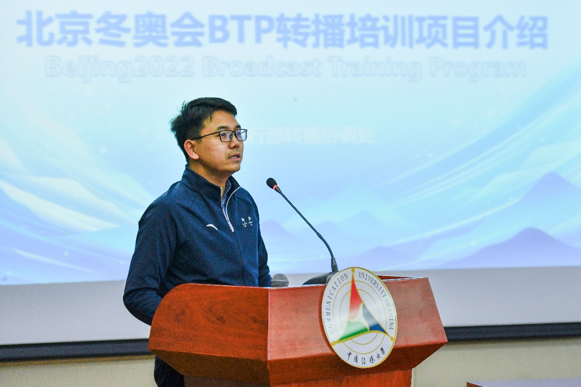 随后,北京冬奥组委媒体运行部转播协调处高博处长就北京2022年冬奥会BTP转播培训项目作了宣讲。高博处长从奥运电视转播简史及概况入手,通过短片等方式介绍了冬奥会场地、BTP转播培训项目选拔计划、世界杯直播在线观看岗位分配、BTP项目招募流程等。