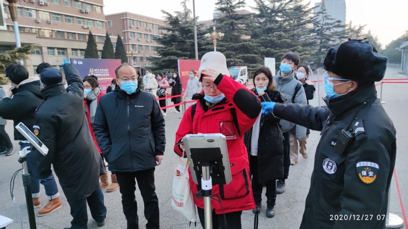 为确保防疫工作的万无一失,在考场消杀、餐厅消杀、准备备用隔离考场等环节基础上,我校在考生入校、入楼、入场时又设置了三道健康保护屏障。考生入校时,电子化入校设备可刷脸瞬时读取考生核酸检测数据、行程绿码数据、准考证数据、身份证数据等,配合安保人员体温检测,可实现考生快速入校。