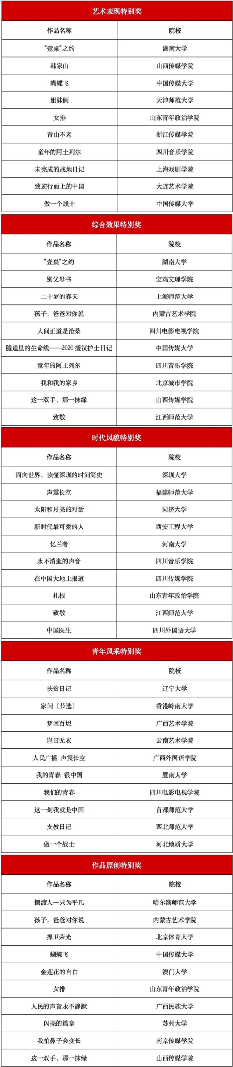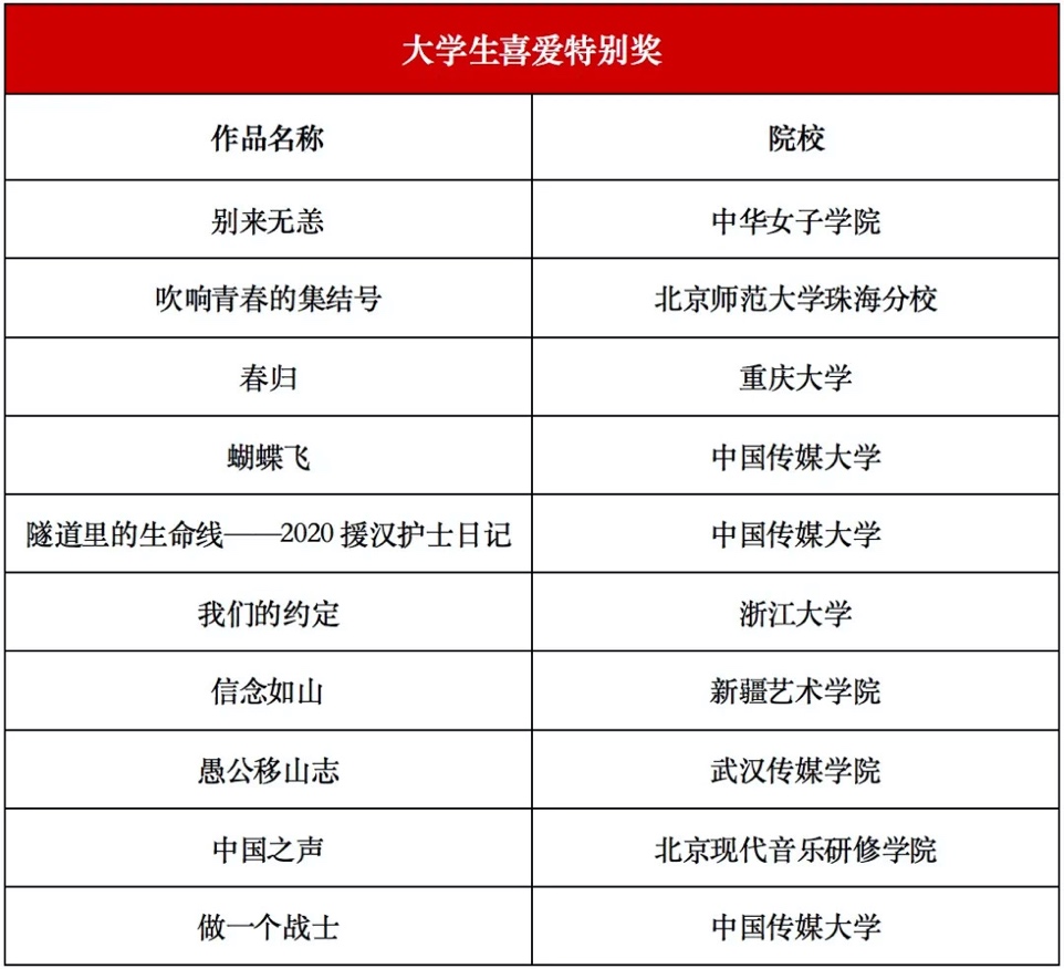 经过为期1个月的线上展映,在评委会严谨的评审下,最终评选出艺术表现特别奖、综合效果特别奖、时代风貌特别奖、青年风采特别奖、作品原创特别奖各10部。本届大会还特别邀请了包括清华大学、北京大学、兰州大学、哈尔滨工程大学等31所高校学生共同投票选出了大学生喜爱特别奖。获得特别奖项作品的指导教师同时获得优秀指导教师奖,进入展映环节的院校获得优秀组织奖。