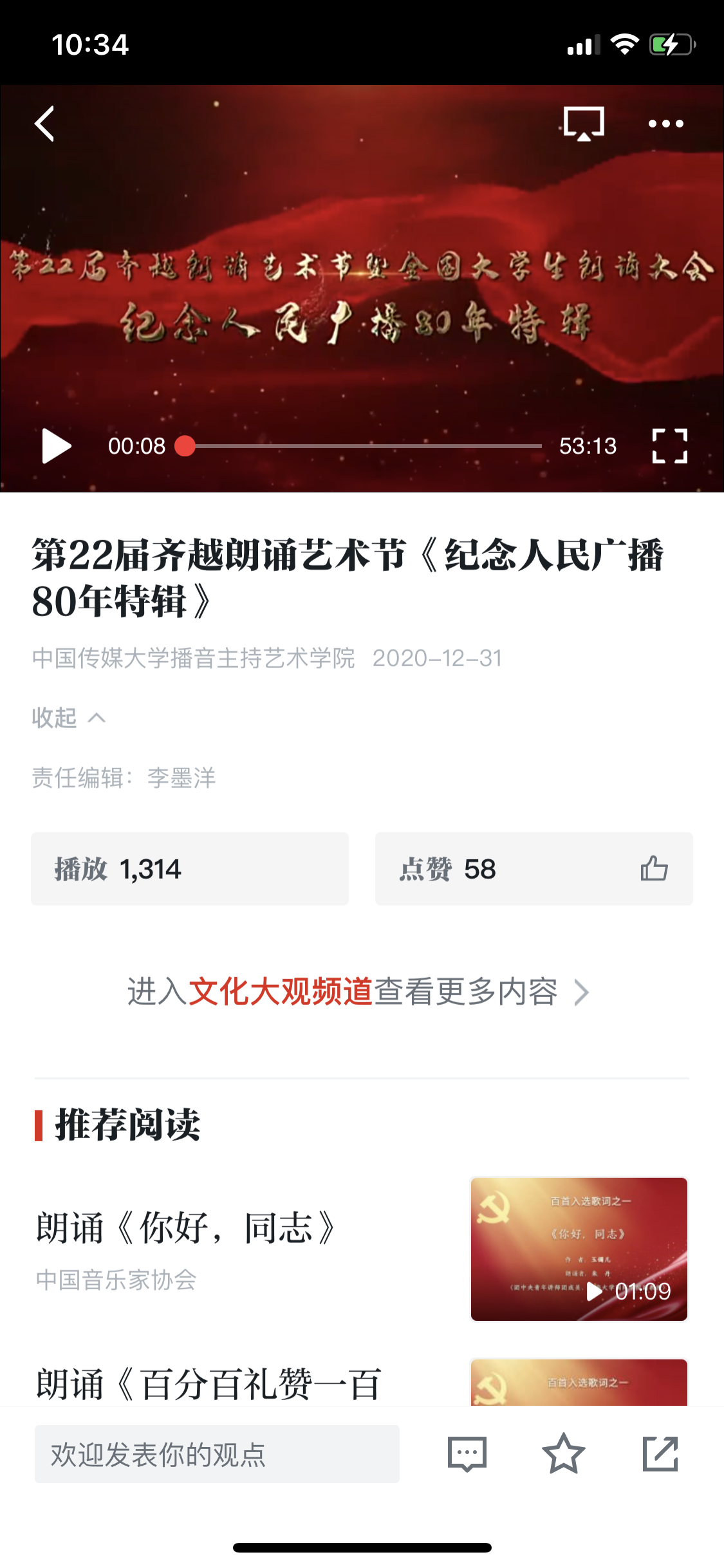 (通讯员 高原 张师迅)近日,随着《纪念人民广播80年特辑》在“学习强国”学习平台的正式上线,第22届齐越朗诵艺术节暨全国大学生朗诵大会圆满落下帷幕。该活动由中华人民共和国教育部、国家语言文字工作委员会主管,教育部关心下一代工作委员会、教育部语言文字应用管理司指导,世界杯直播在线观看主办,世界杯直播在线观看播音主持艺术学院承办,中宣部“学习强国”学习平台提供展映支持。
