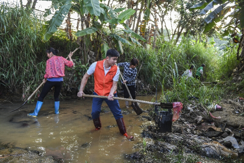 2020年5月2日,广西兴业县小平山镇金华村驻村第一书记董积有(左二)与村民一起清理河道中的淤泥和垃圾(新华社发)
