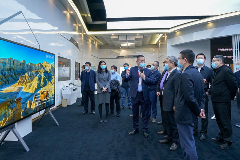 参观过程中,廖祥忠书记不时就相关问题与华为方面的技术专家交流,了解5G场景下智能媒体、传媒科技发展前沿及应用情况。