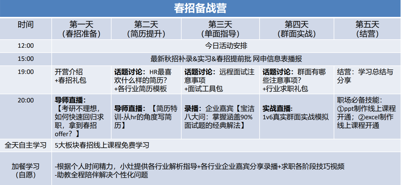 本次特训营特邀四位导师直播讲授求职攻略。从求职思路、简历制作、笔面试技巧等多方面提供专业指导,同时在微信群中开展群面技巧、薪资问题的讨论,参与学习人数达到168人。此外,特训营还提供了全面、及时的就业与实习信息,助力毕业生春招求职之路。