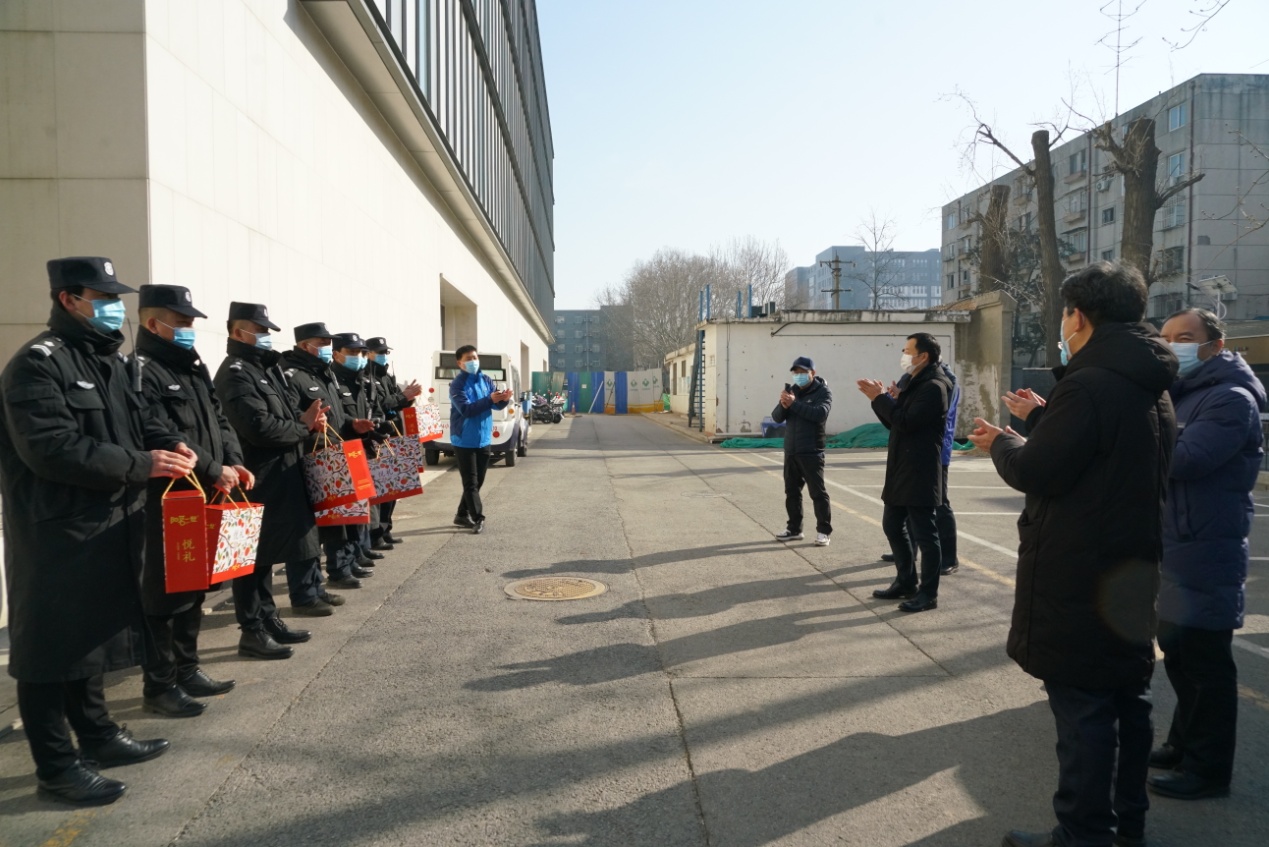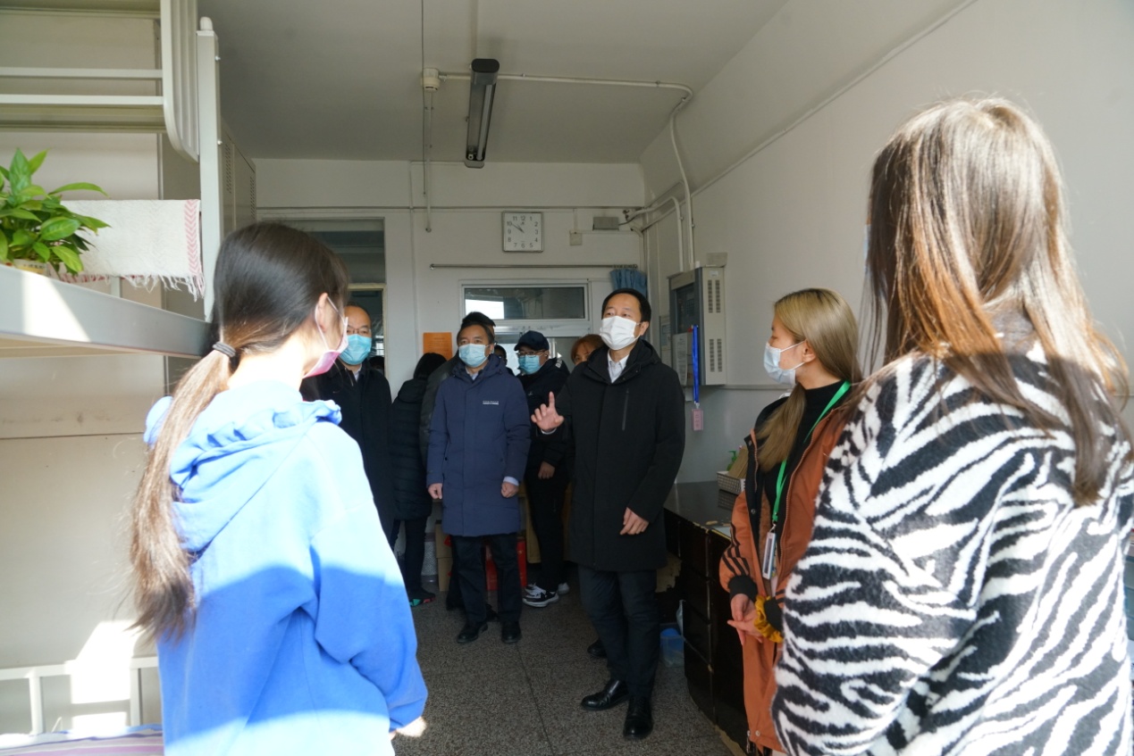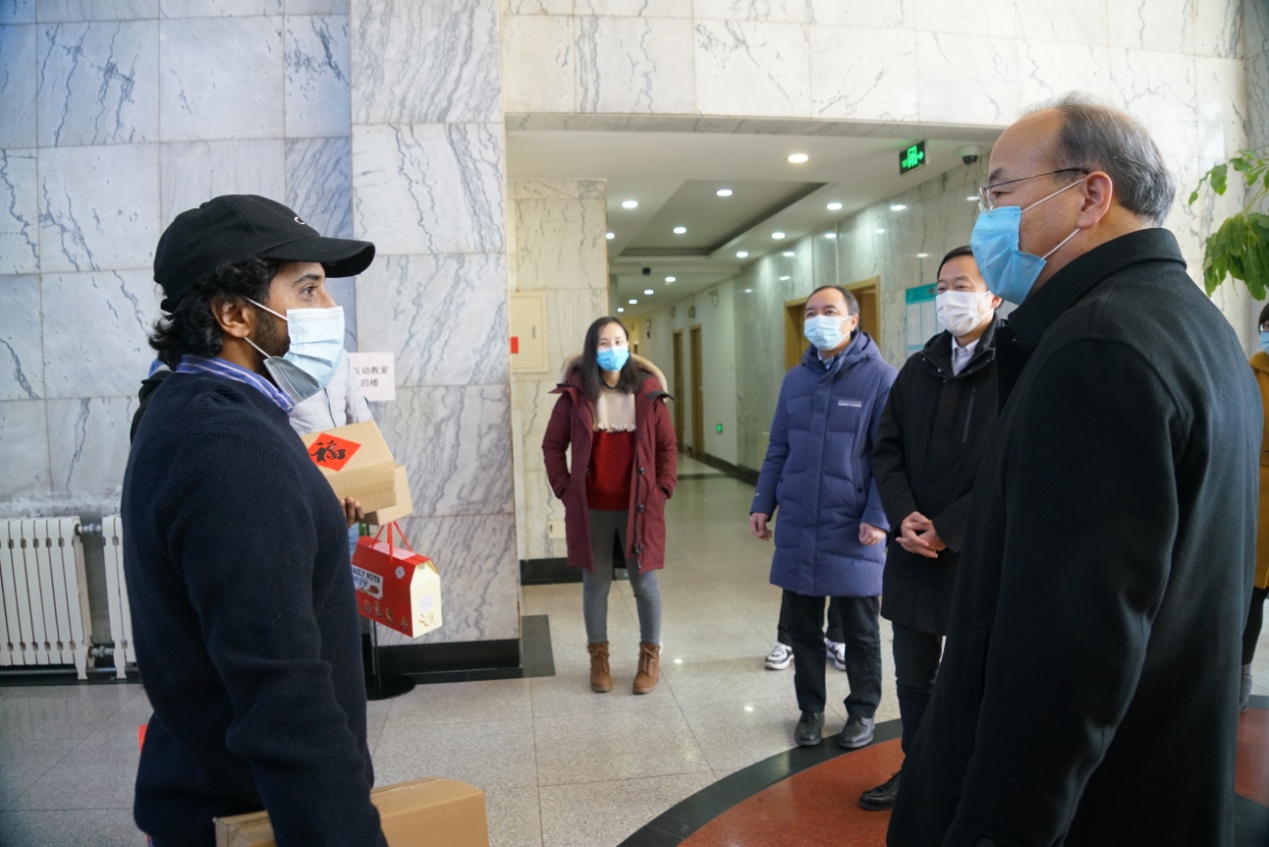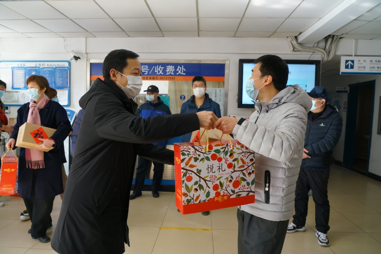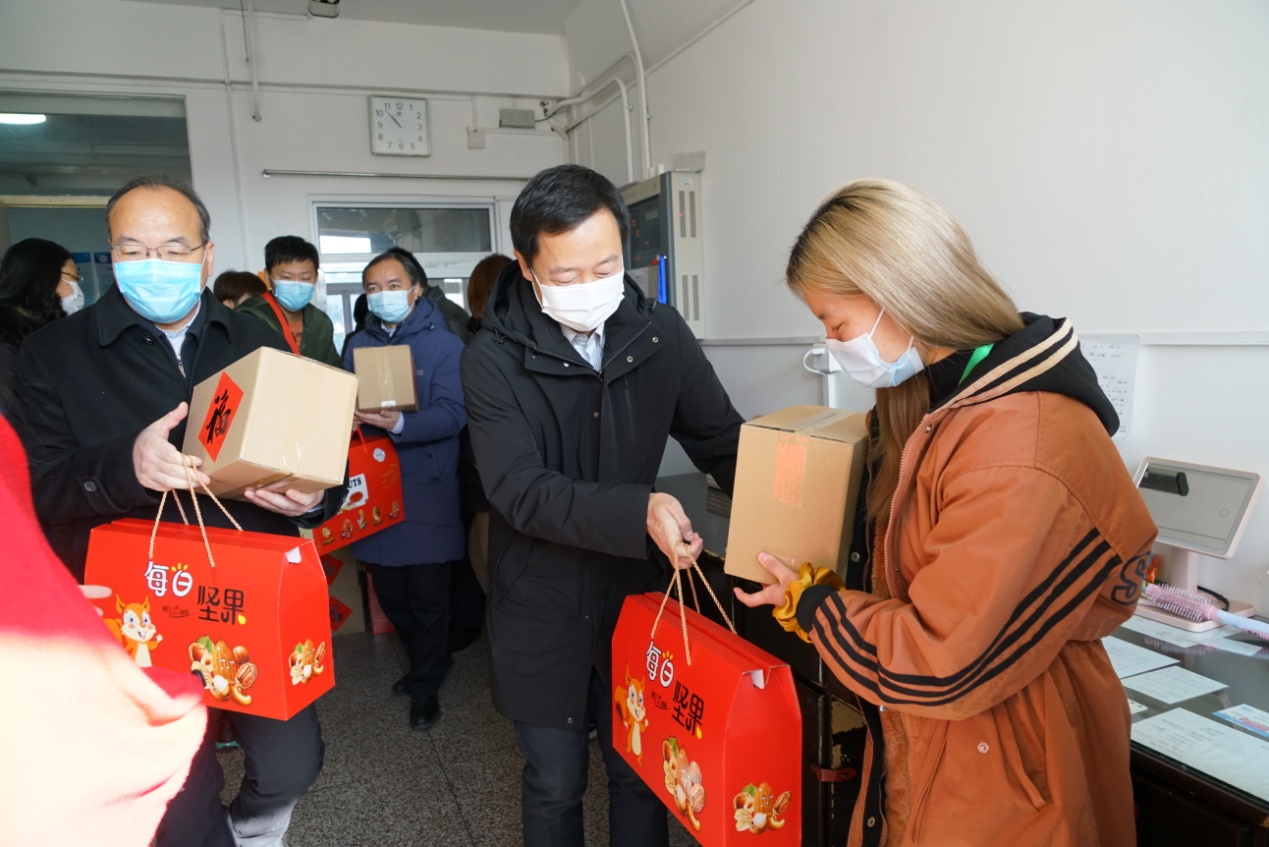 校领导先后来到后勤服务大厅、维修部、南院锅炉房、校园安全指挥中心、东配电室、留学生公寓、保安队、校医院、学生公寓、北苑餐厅等处,看望慰问后勤职工、校园安保人员、医务工作者和留校过节学生,向他们致以节日问候和新春祝福,并送上慰问品。