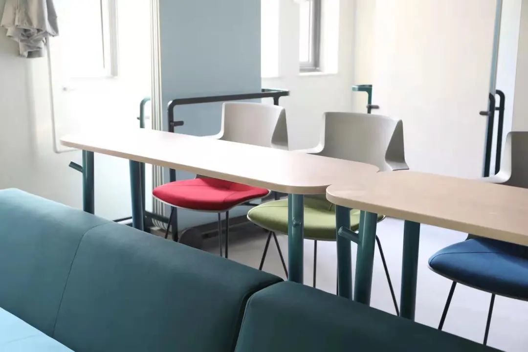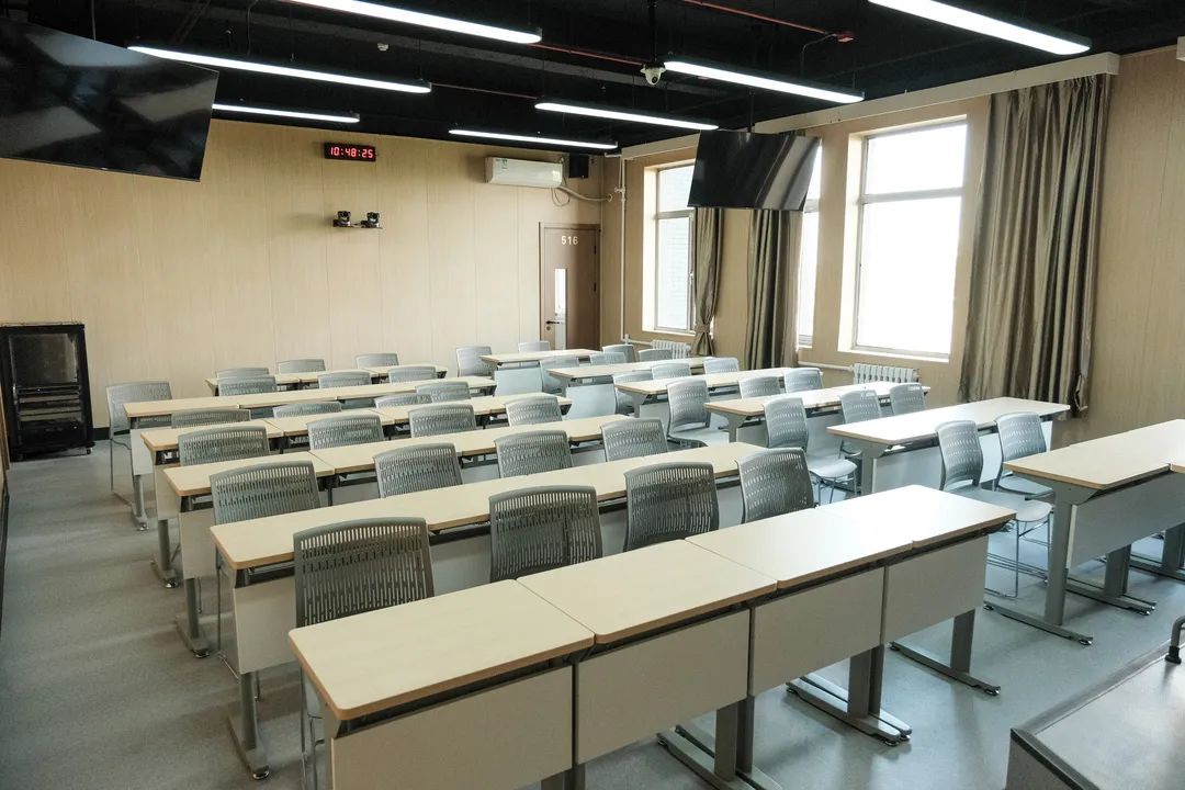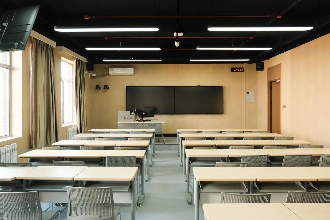 天花板新装穿孔吸音铝板,营造出安静舒心的教学氛围。教室指示标识清晰明了,推开教室门,光线柔和而温馨。现代化课桌轻便灵活,座椅参考人体工学进行了贴心设计,舒适度大幅提升!